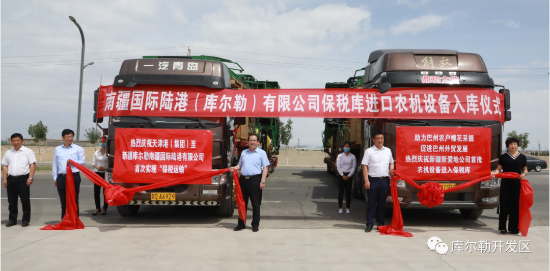 2020年6月11日,6臺CP690自走式大型采棉機(jī)“保稅運(yùn)輸”順利抵達(dá)南疆國際陸港(庫爾勒)有限公司公用型保稅倉庫,實(shí)現(xiàn)了南疆國際陸港(庫爾勒)有限公司與天津港海陸兩港聯(lián)動。