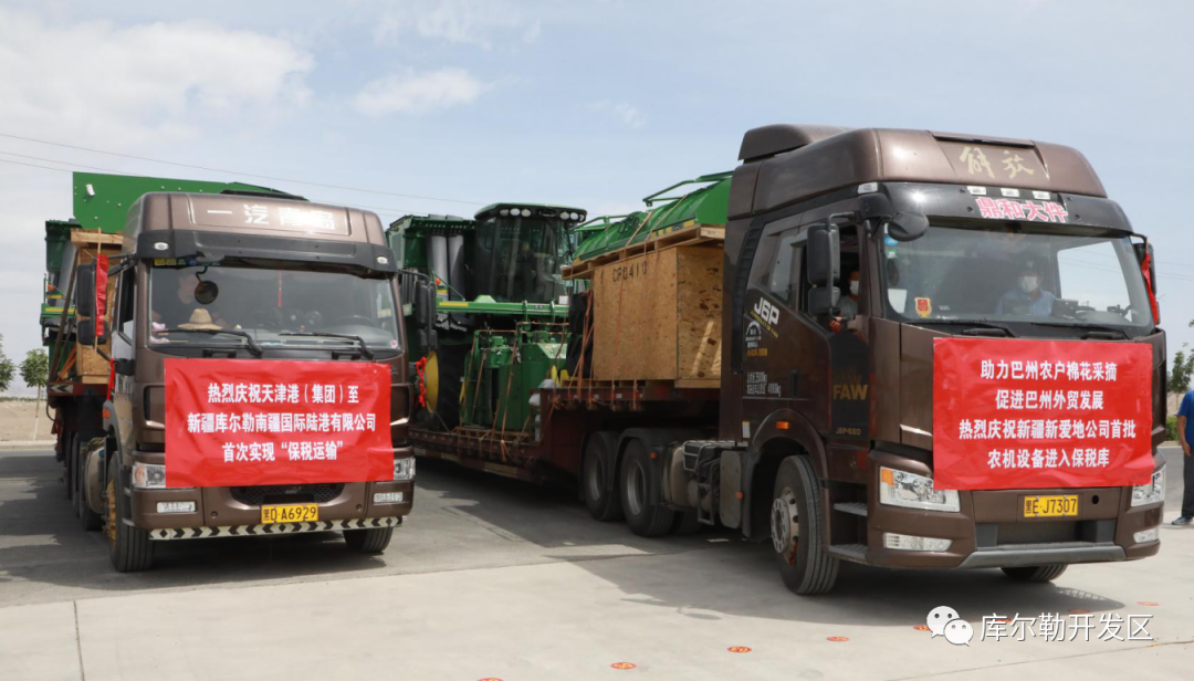 6臺CP690自走式大型采棉機(jī)及60箱配件,從天津港碼頭上岸,在新疆庫爾勒海關(guān)申報(bào)保稅放行,內(nèi)陸運(yùn)輸至南疆國際陸港(庫爾勒)有限公司公用型保稅倉庫。此項(xiàng)業(yè)務(wù)是新疆進(jìn)口摘棉機(jī)第一次采用內(nèi)陸保稅物流方式,也是南疆陸港保稅庫承接的首批進(jìn)口機(jī)械設(shè)備,該業(yè)務(wù)模式有效緩解進(jìn)口企業(yè)關(guān)稅資金壓力。