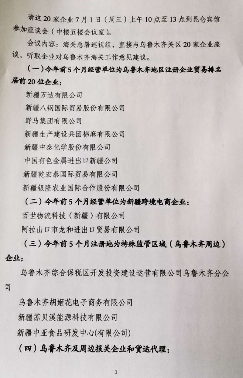 2020年7月1日上午10點-13點,假新疆昆侖賓館中樓五樓會議室,海關總署黨委第九巡視組召開了巡視烏魯木齊海關后的第一次關企座談會。今年前五個月經營單位為烏魯木齊地區(qū)注冊且企業(yè)貿易排名居前20位之內的企業(yè)、今年前五個月經營單位為新疆的跨境電商企業(yè)、今年前五個月注冊地為特殊監(jiān)管區(qū)域(烏魯木齊周邊)的企業(yè)、烏魯木齊周邊保管企業(yè)和貨運代理企業(yè),共二十家單位均派出代表參會。會上,各位代表就今年疫情影響及應對措施、面臨世界經貿形勢持續(xù)走低壓力下的新疆企業(yè)如何走出困境、為促進企業(yè)發(fā)展、關企寫作與互動等方面積極踴躍發(fā)言,提出了很多好的建議與意見?偸鹧惨暯M成員將上述給位代表提出的中肯意見和建議一一記錄在案,表示將協(xié)調烏魯木齊海關進行充分溝通積極解決。